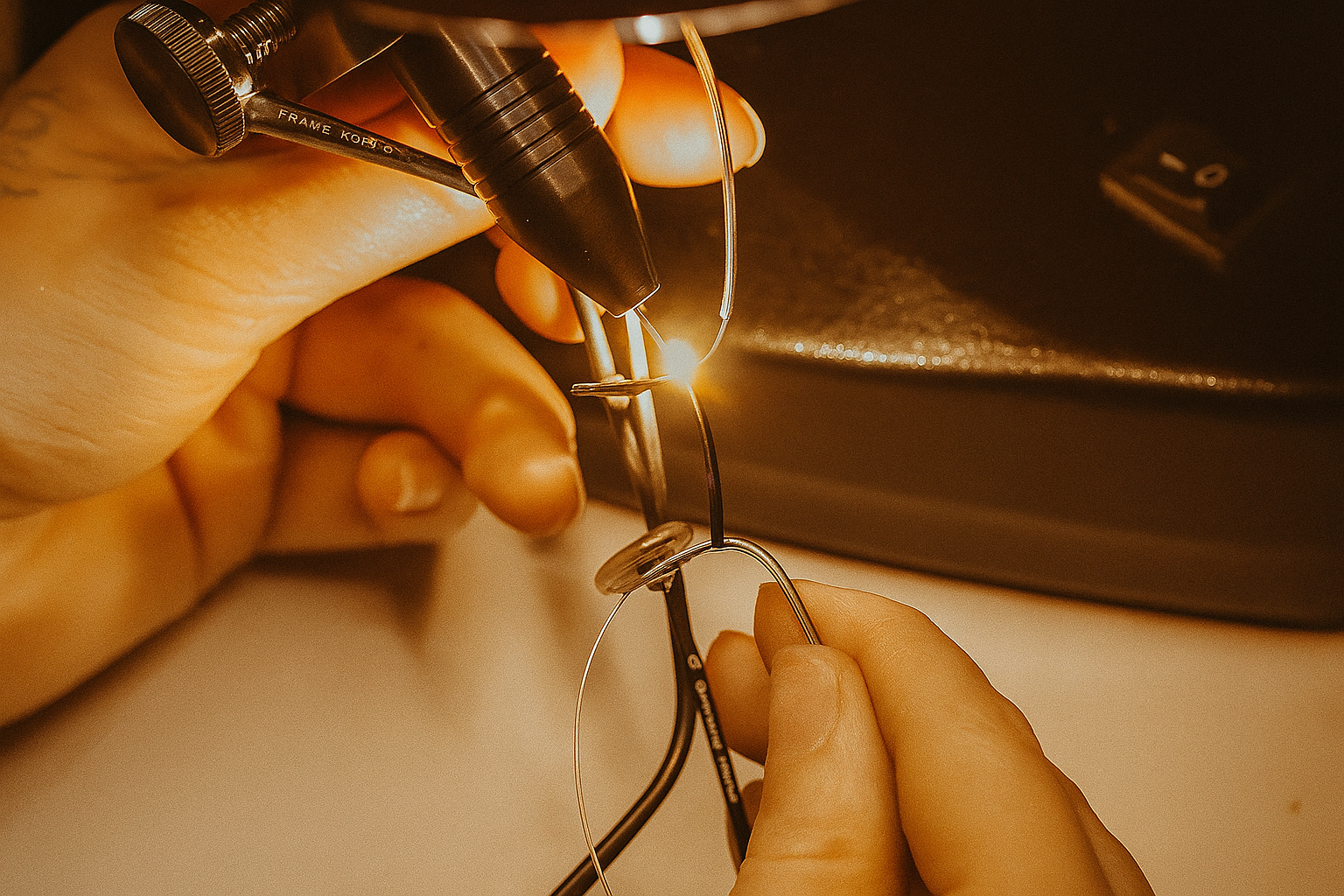 Лазерная сварка. Современный метод ремонта - точечная лазерная сварка. Преимущество в том, что лазер локально нагревает только нужную точку, что идеально для тонких и пружинящих металлов (например, титана). Лазерной сваркой можно аккуратно соединить даже титановые оправы, которые почти не поддаются обычной пайке. В нашем оснащении есть аппараты для лазерной сварки, и мы успешно восстанавливаем сломанные дужки и мостики из титана и Memory Metal (нитинола). Стоимость выше, но результат того стоит - прочность соединения очень высокая, и на вид почти незаметно.